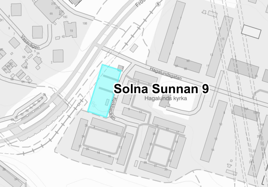 Solna är Sveriges tredje minsta kommun till ytan, med en landareal på endast 20 km². Befolkningsmässigt är Solna landets 27:e största kommun. Hagalund en av åtta stadsdelar i Solna kommun. Hagalund hade 8 898 invånare (år 2013), vilket utgör 12,2 procent av Solna kommuns totala invånarantal.Bebyggelsen utgörs huvudsakligen av bostäder, med åtta blåfärgade höghus som främsta kännetecken. Byggnaderna är 100 meter långa och 14 våningar höga. Husen stod färdiga 1973,